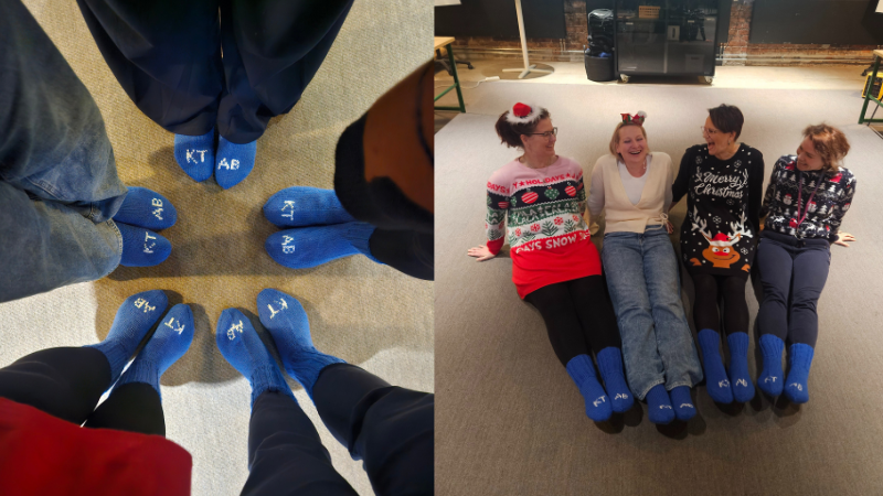 Idag var det äntligen dags att dela ut gåvorna. Stämningen var varm och hjärtlig när kollegorna fick sina sockor. Skratt, glada kommentarer och spontana provningar fyllde rummet. Vi avslutade med en gemensam bild – många fötter i färgglada yllesockor, ett motiv som säger allt om gemenskap och julglädje.